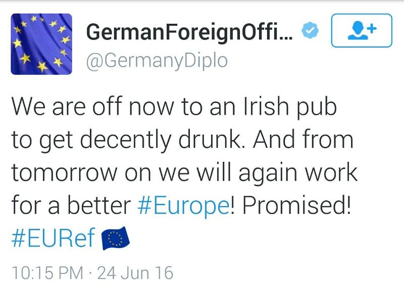 Γράφουν λοιπόν οι Γερμανοί του Υπουργείου των Εξωτερικών τους: «Βρισκόμαστε έξω σε μια Ιρλανδική παμπ, και θα μεθύσουμε με ευπρέπεια. Και από αύριο θα πιάσουμε πάλι δουλειά για μια καλύτερη Ευρώπη. Το υποσχόμαστε»