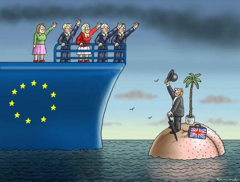 Από τη Νταϊάν Κρούγκερ, σε ένα σκίτσο που πρωτοεμφανίστηκε στην Wall Street Journal, ένας χάρτης της Ευρώπης, με τις χώρες ραμμένες με κλωστή μεταξύ τους και ένα γιγάντιο ψαλίδι να κόβει τις κλωστές που ενώνουν το Νησί με την Ήπειρο.