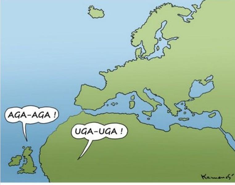 Στη γελοιογραφία του Μάριαν Καμένσκι, τα θαλάσσια ρεύματα έχουν παρασύρει τις Βρετανικές Νήσους χαμηλά στον Ατλαντικό, στο ύψος της Σενεγάλης. «Άγκα,άγκα!» ακούγεται από τις Βρετανικές Νήσους.«Ούγκα,ούγκα!», η απάντηση από τη Μαύρη Ήπειρο.