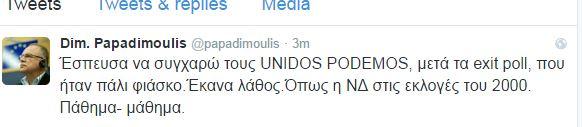 «Έσπευσα να συγχαρώ τους UNIDOS PODEMOS, μετά τα exit poll, που ήταν πάλι φιάσκο.Έκανα λάθος.Όπως η ΝΔ στις εκλογές του 2000. Πάθημα- μάθημα».
