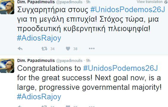 Ειδικότερα, ο Δ. Παπαδημούλης έγραψε σε ανάρτησή του στο Twitter: «Συγχαρητήρια στους #UnidosPodemos26J για τη μεγάλη επιτυχία! Στόχος τώρα, μια προοδευτική κυβερνητική πλειοψηφία! #AdiosRajoy».