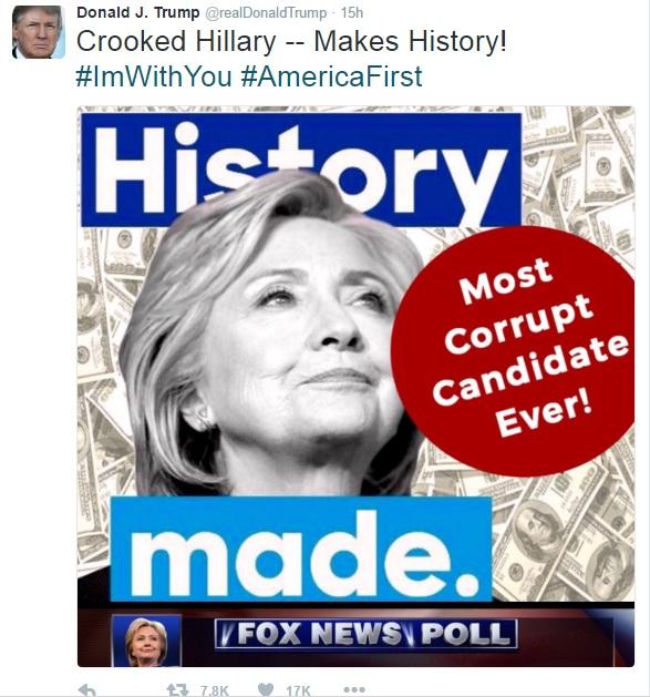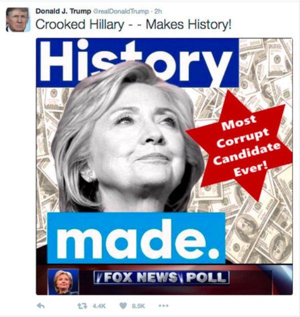 Ο υποψήφιος πρόεδρος των Ρεπουμπλικάνων Ντόναλντ Τραμπ ανήρτησε χθες στο Twitter μια εικόνα-κολλάζ με τη Δημοκρατική αντίπαλό του Χίλαρι Κλίντον, εκατοδόλαρα, ένα άστρο του Δαυίδ και τη λεζάντα «η πιο διεφθαρμένη υποψήφια που έχει υπάρξει ποτέ!», προκαλώντας κατακραυγή και σύγχυση στους ιστοτόπους κοινωνικής δικτύωσης.