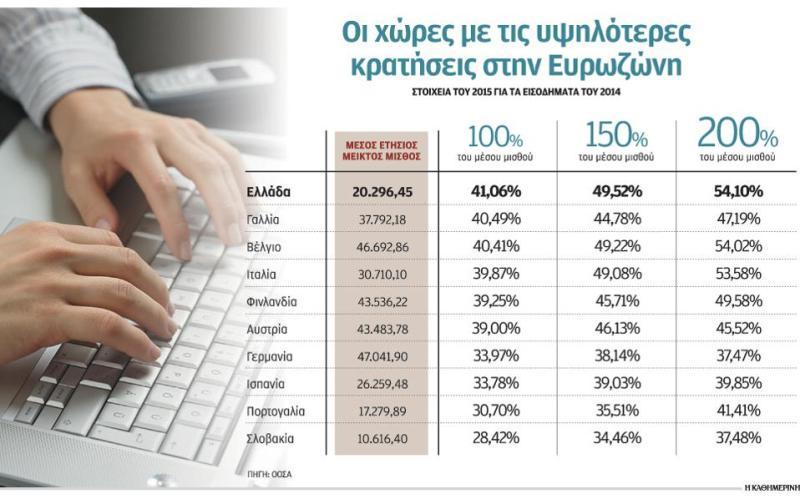 Ο σχετικός πίνακας δείχνει τα ποσοστά κρατήσεων (συμπεριλαμβανομένων πάντοτε των εργοδοτικών εισφορών) σε 10 χώρες της Ευρωζώνης, οι οποίες θεωρούνται από τις «ακριβότερες» (δηλαδή εφαρμόζουν τα υψηλότερα ποσοστά κρατήσεων). Η Ελλάδα φιγουράρει στην πρώτη θέση και στις τρεις μισθολογικές κατηγορίες: 100% του μέσου μισθού, 150% του μέσου μισθού και 200% του μέσου μισθού.