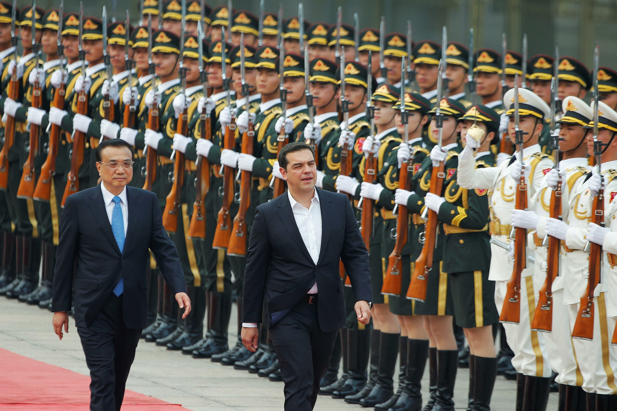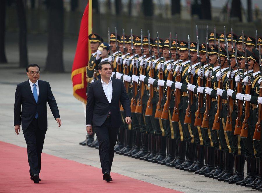 Παρουσία του Κινέζου ομολόγου του, Λι Κετσιάνγκ, πραγματοποιήθηκε η ανάκρουση των εθνικών ύμνων των δύο χωρών. Στη συνέχεια, ο Αλ. Τσίπρας και ο Λι Κετσιάνγκ επιθεώρησαν τιμητικό άγημα από άνδρες και γυναίκες του στρατού και της αεροπορίας της Κίνας.