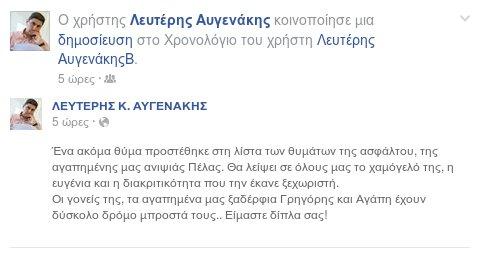 Ένα συγκινητικό μήνυμα ανήρτησε στον λογαριασμό του στο Facebook ο βουλευτής της ΝΔ, Λευτέρης Αυγενάκης, για τον τραγικό χαμό της 18χρονης ανιψιάς του, Πέλας Κουτεντάκη, σε τροχαίο δυστύχημα, στις Μοίρες Κρήτης.