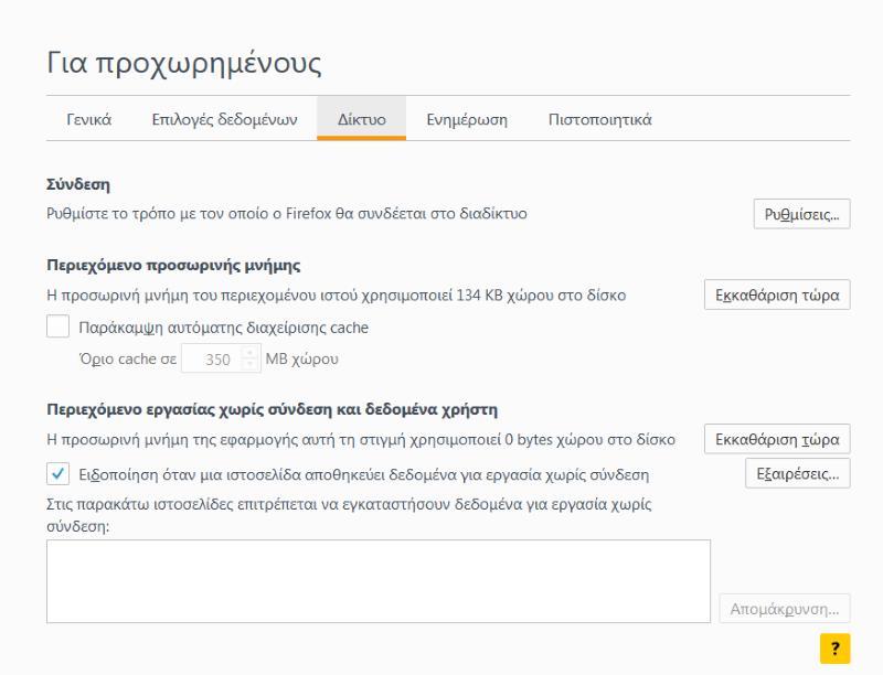 Επιλέξτε “Options” από το μενού του Firefox και εκεί κάντε κλικ στo “Advanced” [Για προχωρημένους]. Από εκεί ανοίξτε την καρτέλα Network [Δίκτυο]. Όπως βλέπετε, από εδώ μπορείτε να ρυθμίσετε το μέγεθος της cache, επιλέγοντας το “Override automatic cache management” [Παράκαμψη αυτόματης διαχείρισης cache]. Εάν έχετε αρκετή μνήμη RAM και ελεύθερο χώρο στο δίσκο, η αύξηση του μεγέθους της cache θα βελτιώσει τις επιδόσεις του Firefox.