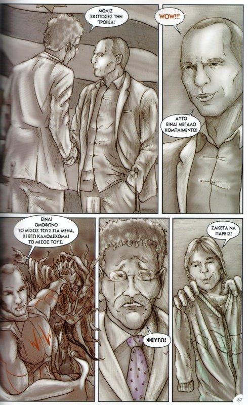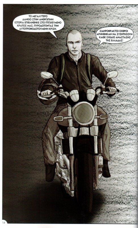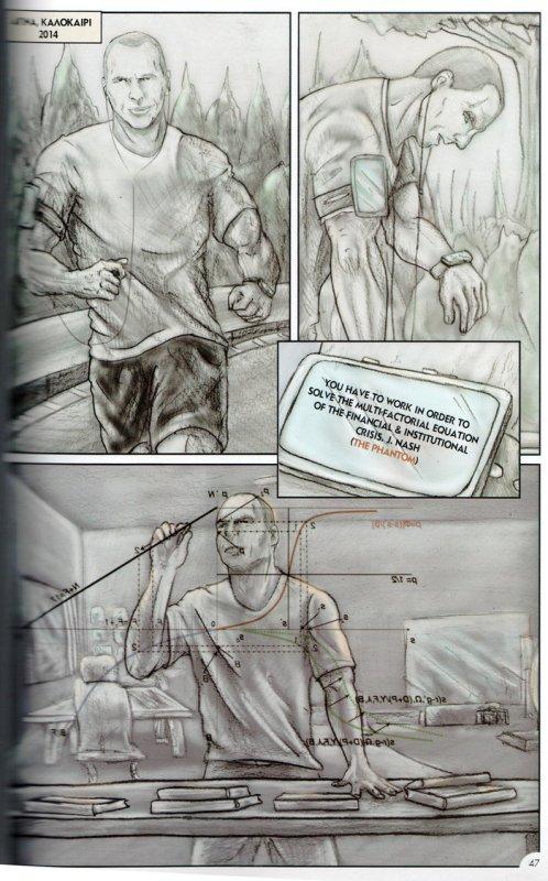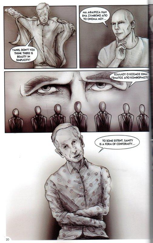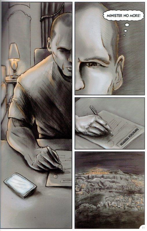 Παίζοντας με τους τόνους του γκρίζου χρώματος αφηγείται τα κύρια γεγονότα διά των βασικών προσώπων της ιστορίας. Τα κεφάλαια: «Η παραίτηση κατ’ απαίτηση των δανειστών», «Στο εργαστήριο του V στην Αίγινα», «Λίμνη Κόμο-Η απαρχή», «2010-2014, τα κινήματα, η βία και η ύφεση στην Ελλάδα», «Εργαστήριο του V πριν τις εθνικές εκλογές», «2015, η ορκωμοσία της νέας κυβέρνησης στην Ελλάδα», «To WOW!», «Τροϊκανοί vs V, οι επιθέσεις μέσα στα Eurogroup», «Τρόικα εσωτερικού», «Ο τζίτζικας, ο μέρμηγκας και το grexit», «Η Άνοιξη της Αθήνας, και το Όχι που έγινε Ναι», «Το Όχι που έγινε Ναι με την συνθηκολόγηση της Αριστεράς». Και, τελευταίο σκίτσο το πρόσωπο του κ. Βαρουφάκη με φόντο την ήπειρό μας με τίτλο «Ευρώπη, ερχόμαστε» και κάτω δεξιά η προαναγγελία «Συνεχίζεται»…