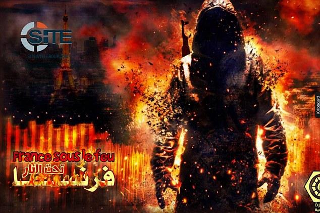 Σε κάποιες από αυτές εικονίζεται το Παρίσι και ο Πύργος του Άιφελ στο βάθος να φλέγονται ενώ ένας τρομοκράτης με κουκούλα απομακρύνεται. Η λεζάντα αναφέρει: «France sous le feu» (Η Γαλλία φλέγεται), στα γαλλικά και στα αραβικά.