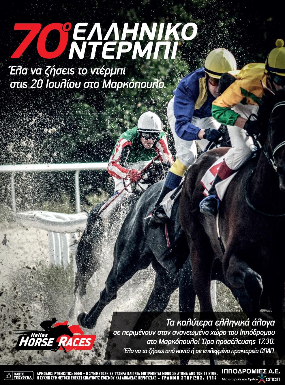 Η απόλυτη ιπποδρομία με τα καλύτερα καθαρόαιμα ελληνικά άλογα θα πραγματοποιηθεί την ερχόμενη Τετάρτη 20 Ιουλίου στο Μαρκόπουλο. Η Ιπποδρομίες ΑΕ, μέλος του Ομίλου ΟΠΑΠ που εδώ και επτά μήνες έχει αναλάβει τη διοργάνωση των ελληνικών ιπποδρομιών, υπόσχεται μοναδικές κούρσες και πλούσιο θέαμα στον στίβο κατά το 70ο ελληνικό ντέρμπι. Tο ντέρμπι διαχρονικά θεωρείται η κούρσα της χρονιάς και αποτελεί πόλο έλξης για τους έλληνες ιδιοκτήτες, προπονητές, αναβάτες, ιπποπαραγωγούς και πάνω απ’ όλα φιλίππους. Τα άλογα που παίρνουν μέρος και θα διεκδικήσουν το κύπελλο είναι καθαρόαιμα ηλικίας τριών ετών και θα αγωνιστούν για τη νίκη καλύπτοντας απόσταση των 2.400 μέτρων. Αναμενόμενα η αδρεναλίνη θα ανέβει στα ύψη.