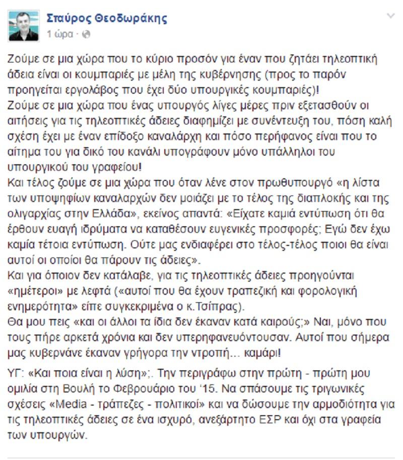 Για υπουργικές κουμπαριές και εργολαβίες έγραψε στη σελίδα του στο facebook, ο Σταύρος Θεοδωράκης, σχολιάζοντας τις τηλεοπτικές άδειες.