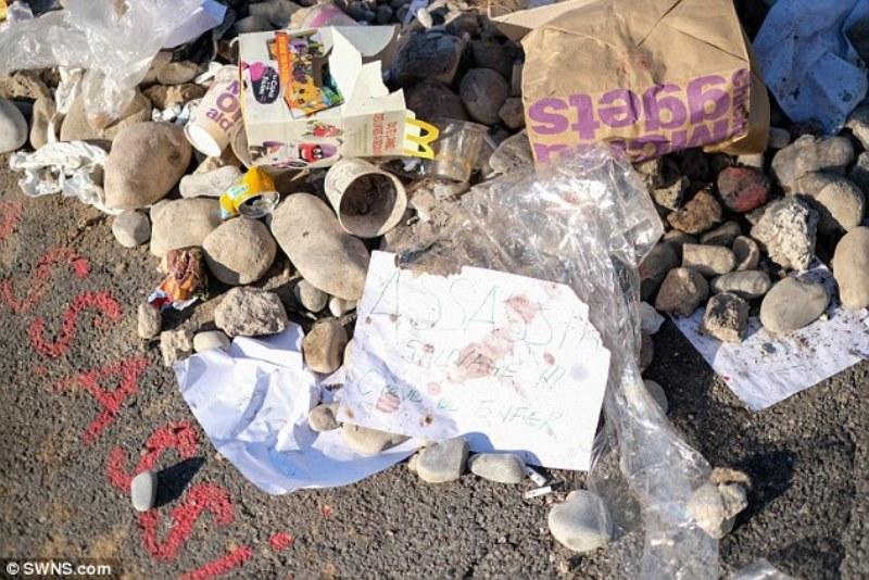 Πέτρες, σκουπίδια, αποτσίγαρα και οργισμένα σημειώματα με λέξεις όπως «δολοφόνος» και «δειλός» είναι μερικά μόνο από τα αντικείμενα που έχουν πετάξει στο σημείο που έπεσε νεκρός ο 31χρονος, που σκότωσε από 84 ανθρώπους, από τα πυρά αστυνομικών.