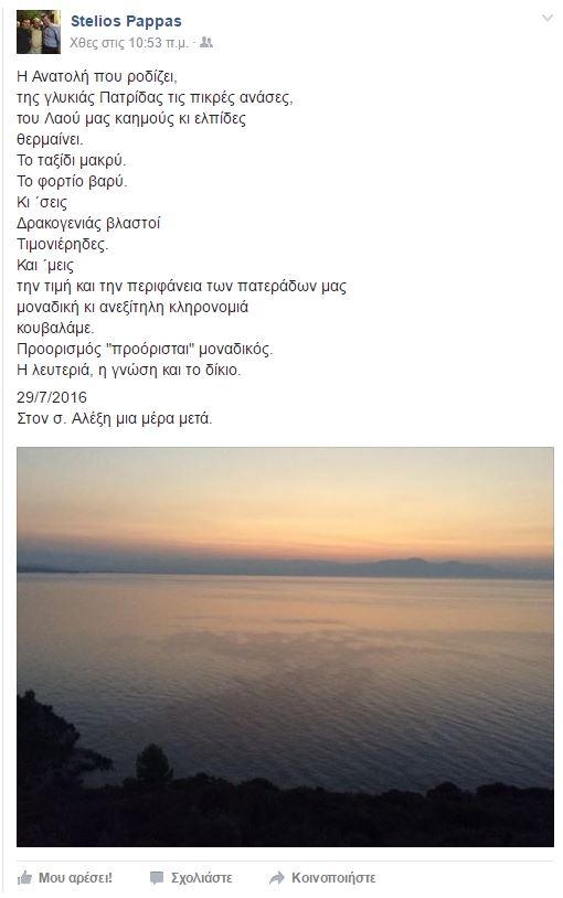 «Χρόνια πολλά» με ένα ποίημα ευχήθηκε ο πατέρας του υπουργού Επικρατείας και στενού συνεργάτη του πρωθυπουργού, Νίκου Παππά, Στέλιος.