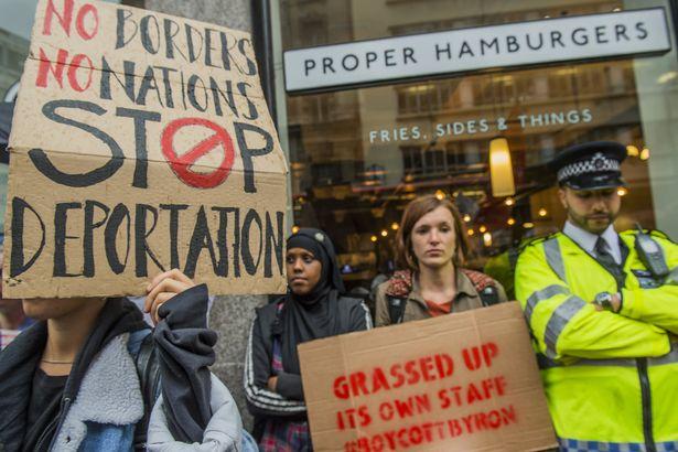 Εκατοντάδες διαδηλωτές συγκεντρώθηκαν έξω από υποκαταστήματα της γνωστής αλυσίδα μπέργκερ Byron στο κεντρικό Λονδίνο ώστε να διατηρηθούν για την πολιτική που ακολουθεί η αλυσίδα αναφορικά με τους μετανάστες εργαζόμενους της.