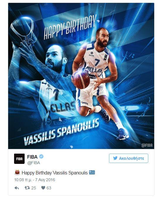H Παγκόσμια ομοσπονδία μέσω των social media δημοσίευσε φωτογραφία για τα γενέθλια του Σπανούλη, όπου απεικονίζεται με τη φανέλα της Εθνικής και τη λεζάντα «χρόνια πολλά Βασίλη Σπανούλη».