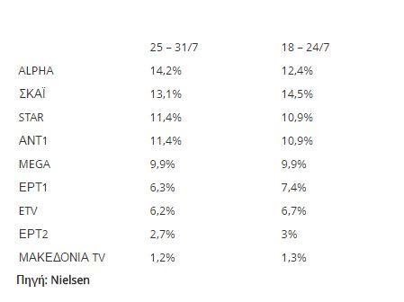 Η κορυφή της τηλεθέασης έχει περάσει πλέον στους σταθμούς του ΣΚΑΪ και του Alpha, οι οποίοι εναλλάσσονται στην πρώτη θέση.