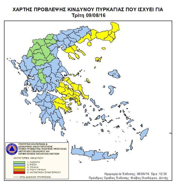 Σύμφωνα με το Χάρτη Πρόβλεψης Κινδύνου Πυρκαγιάς που εκδίδει η Γενική Γραμματεία Πολιτικής Προστασίας του Υπουργείου Εσωτερικών και Διοικητικής Ανασυγκρότησης (www.civilprotection.gr), για σήμερα, Τρίτη 9 Αυγούστου 2016, προβλέπεται υψηλός κίνδυνος πυρκαγιάς (κατηγορία κινδύνου 3) για τις εξής περιοχές:
