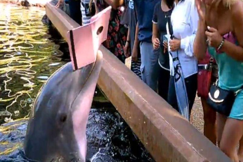 Το δελφίνι μπροστά στα έκπληκτα μάτια των επισκεπτών σηκώνεται πιο πάνω από την επιφάνεια του νερού και αρπάζει ένα ipad από μια κοπέλα την ώρα που το τράβαγε φωτογραφία.Η κοπέλα δυστυχώς δεν ήταν πολύ γρήγορη με αποτέλεσμα να μην προλάβει το δελφίνι και το ipad της να καταλήξει στο νερό.