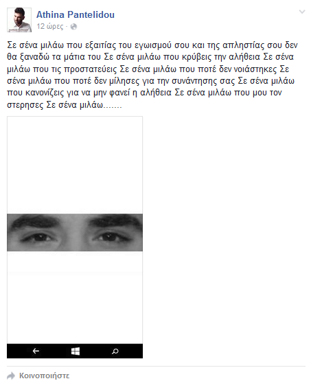 «Σε σένα μιλάω που εξαιτίας του εγωισμού σου και της απληστίας σου δεν θα ξαναδώ τα μάτια του. Σε σένα μιλάω που κρύβεις την αλήθεια. Σε σένα μιλάω που τις προστατεύεις. Σε σένα μιλάω που ποτέ δεν νοιάστηκες. Σε σένα μιλάω που ποτέ δεν μίλησες για την συνάντησης σας. Σε σένα μιλάω που κανονίζεις για να μην φανεί η αλήθεια. Σε σένα μιλάω που μου τον στέρησες. Σε σένα μιλάω…….»