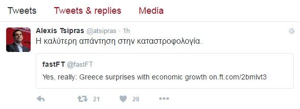 Το δημοσίευμα των Financial Times με τίτλο «Η Ελλάδα εκπλήσσει με την οικονομική της ανάπτυξη» σχολίασε στον προσωπικό του λογαριασμό στο Twitter ο πρωθυπουργός Αλέξης Τσίπρας.