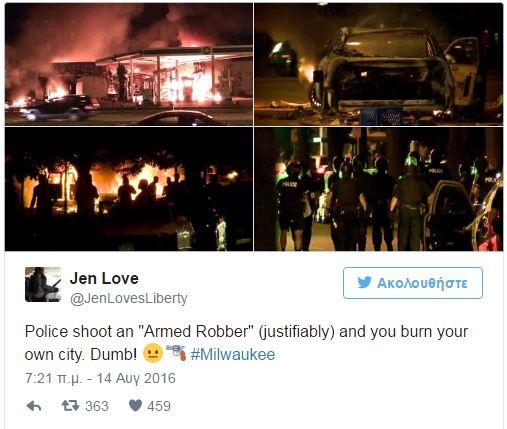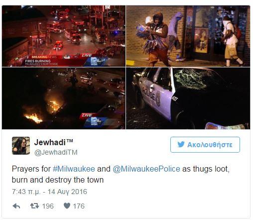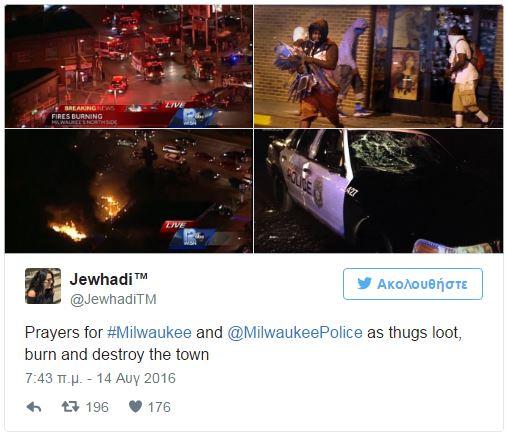 Βίαιες διαδηλώσεις ξέσπασαν σε γειτονικά του Μιλγουόκι, όπου ένας αστυνομικός πυροβόλησε και σκότωσε νεαρό άνδρα, ηλικίας 23 ετών.