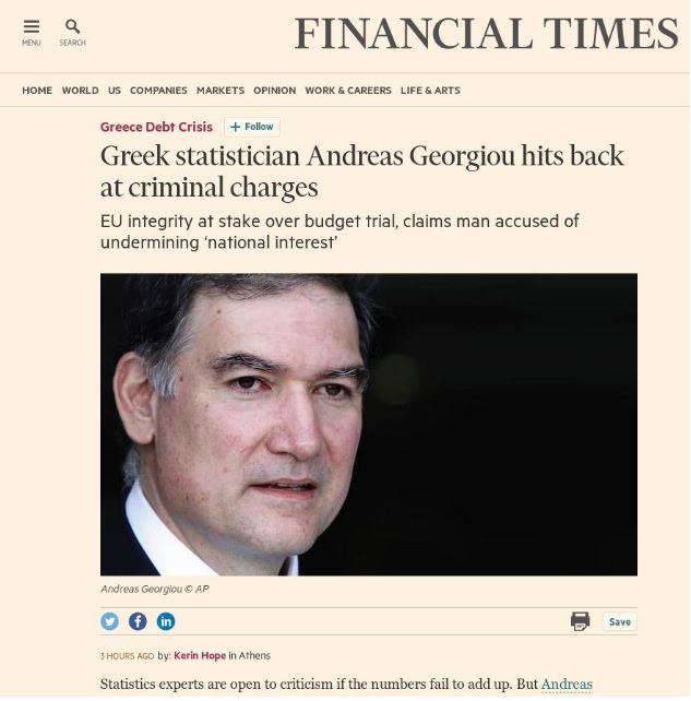 Το δημοσίευμα των FT αναφέρει το ιστορικό της υπόθεσης και φιλοξενεί δηλώσεις του πρώην προέδρου της ΕΛΣΤΑΤ, ο οποίος παραπέμπεται να δικαστεί ενώπιον Τριμελούς Εφετείου Αθηνών για το κακούργημα της ψευδούς βεβαίωσης