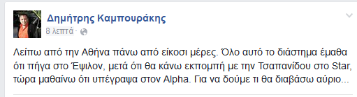 Με αυτή την ανάρτηση στο facebook o δημοσιογράφος Δημήτρης Καμπουράκης διαψεύδει την «τηλεοπτική μεταγραφή του καλοκαιριού». Και συγκεκριμένα διαψεύδει ότι υπέγραψε με τον τηλεοπτικό σταθμό Alpha του Δημήτρη Κοντομηνά, ώστε να παρουσιάζει δίωρη καθημερινή πρωινή εκπομπή από τις 10 έως τις 12, μετά την εκπομπή της Σταματίνας Τσιμτσιλή.
