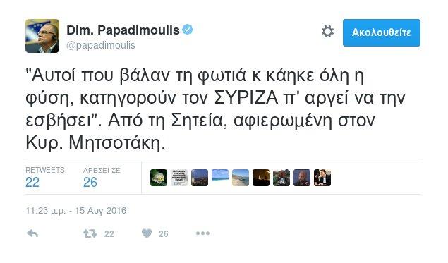 «Αυτοί που βάλαν τη φωτιά κ κάηκε όλη η φύση, κατηγορούν τον ΣΥΡΙΖΑ π’ αργεί να την εσβήσει». Από τη Σητεία, αφιερωμένη στον Κυρ. Μητσοτάκη», έγραψε χαρακτηριστικά στον προσωπικό του λογαριασμό στο twitter.