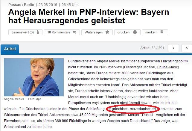 Η Γερμανίδα καγκελάριος έκανε λόγο για “ελληνομακεδονικά σύνορα”, όπως εύκολα μπορεί να δει κανείς στο σχετικό απόσπασμα που παραθέτουμε από τον ιστότοπο της Passauer Neue Presse.