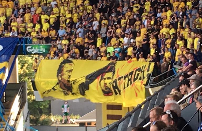 Οι οπαδοί της Μπρόντμπι κρέμασαν πανό στις κερκίδες του γηπέδου, στον αγώνα με τον Παναθηναϊκό για το Europa League, στο οποίο ο Φίρι φαίνεται να κρατάει το κεφάλι του… αποκεφαλισμένου Μπεργκ και να γράφει «επίθεση».