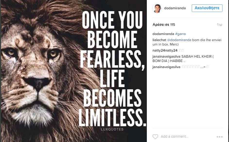 Ο Αλβάρο ς ανάρτησε μια φωτογραφία στον προσωπικό του λογαριασμό στο Instagram του, που απεικονίζει ένα άγριο λιοντάρι, με τη λεζάντα να αναγράφει: «Από την ώρα που θα ξεπεράσεις τους φόβους σου και γίνεις ατρόμητος, η ζωή δεν έχει όρια».