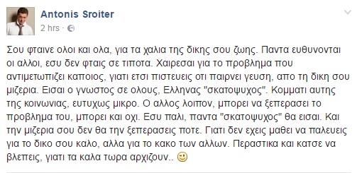 Νέα τοποθέτηση από τον Αντώνη Σρόιτερ στο facebook, μετά την προηγούμενη ανάρτηση της Παρασκευής. Ο παρουσιαστής του κεντρικού δελτίου ειδήσεων του Alpha με την τελευταία ανάρτησή του στην σελίδα του στο γνωστό Μέσο κοινωνικής δικτύωσης αναφέρει: