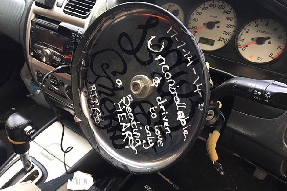 Όταν πήγαν να ελέγξουν το αυτοκίνητό του, ωστόσο, διαπίστωσαν ότι ο τύπος είχε αντικαταστήσει το τιμόνι με… μεταλλικό τηγάνι! Κι όχι μόνο αυτό, αλλά στην επιφάνεια του τηγανιού ήταν γραμμένη η φράση «ανεξέλεγκτος και οδηξγημένος στην αγάπη, μόνο μια καρδιά που χτυπά»!