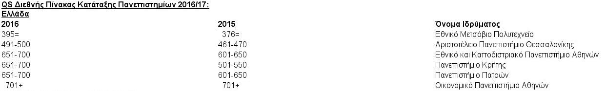 Πτώση σημειώνουν στην κατάταξή τους και το Αριστοτέλειο Πανεπιστήμιο Θεσσαλονίκης, το Εθνικό και Καποδιστριακό Πανεπιστήμιο Αθηνών, το Πανεπιστήμιο Κρήτης και το Πανεπιστήμιο Πατρών.