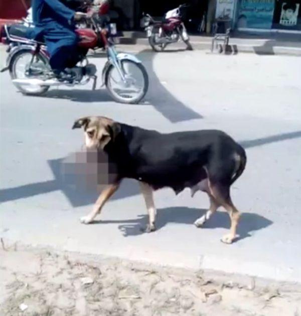 Το αδέσποτο είχε στα σαγόνια του ένα νεκρό μωρό και περιφερόταν στους δρόμους του Πακιστάν. Μάταια επιχείρησαν περαστικοί να του το αποσπάσουν ενώ τελικά το άφησε όταν μπήκε στο δρόμο και άρχισαν να κορνάρουν και τα αυτοκίνητα.