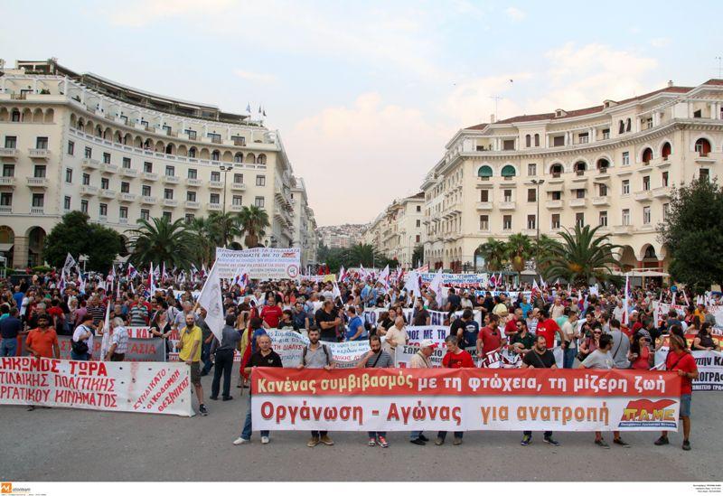 Στη συνέχεια οι διαδηλωτές συγκρότησαν πορεία και μέσω των οδών Εγνατία, Βενιζέλου και της παραλιακής Λεωφόρου Νίκης κατέληξαν στην πλατεία της ΧΑΝΘ, την ώρα που άρχιζε η ομιλία του πρωθυπουργού, Αλέξη Τσίπρα, προς τους παραγωγικούς φορείς. Αστυνομικές δυνάμεις είχαν αποκλείσει το «Βελλίδειο Συνεδριακό Κέντρο», με κλούβες και μεταλλικά κιγκλιδώματα και συμμετέχοντες στην πορεία, αφού διαδήλωσαν φωνάζοντας συνθήματα, κινήθηκαν μέχρι την πλατεία Αριστοτέλους και διαλύθηκαν.