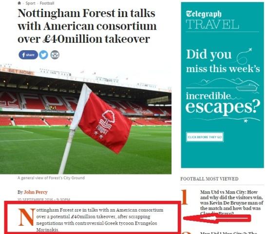 «Η Νότιγχαμ συνομιλεί με αμερικανική κοινοπραξία, μετά τη διακοπή στις διαπραγματεύσεις με τον αμφιλεγόμενο Έλληνα μεγιστάνα Βαγγέλη Μαρινάκη. Ο Μαρινάκης, ιδιοκτήτης του Ολυμπιακού, βρισκόταν σε συνομιλίες για την εξαγορά των μετοχών μέσα στο χρόνο, αλλά βρίσκεται στο επίκεντρο των κατηγοριών για στημένους αγώνες, με την UEFA να πραγματοποιεί έρευνα. Ο Μαρινάκης έχει αρνηθεί τις κατηγορίες, αλλά η Football League θεωρεί πως υπάρχουν σοβαρές ανησυχίες για τις επαφές του με τη Φόρεστ, εξαιτίας του σκανδάλου που πλήττει το ελληνικό ποδόσφαιρο τα τελευταία δύο χρόνια. Η Φόρεστ έχει κόψει ωστόσο τις επαφές με τον Μαρινάκη και είναι σε προχωρημένες συνομιλίες με τους Αμερικανούς. Ο Αλ Χασάουι ήλπιζε να συμφωνήσει στην παραχώρηση του 80% στον Μαρινάκη διατηρώντας το 20% και παραμένοντας πρόεδρος».