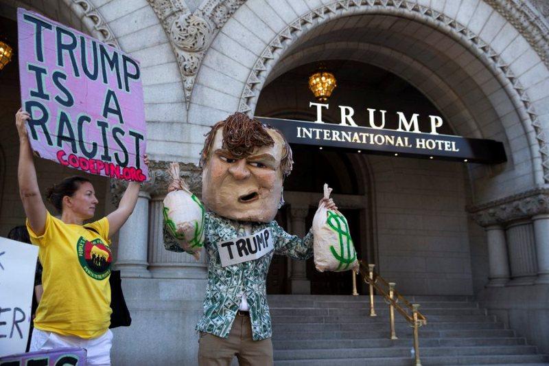 «Ο Τραμπ είναι ρατσιστής» και «Πρόσφυγες και μουσουλμάνοι είναι καλοδεχούμενοι εδώ, το ξενοδοχείο του Τραμπ δεν είναι», ανέφεραν μερικά από τα πλακάτ και τα πανό που κρατούσαν.