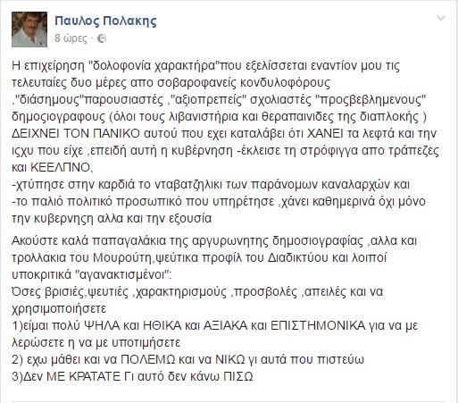 Η επιχείρηση “δολοφονία χαρακτήρα” που εξελίσσεται εναντίον μου τις τελευταίες δυο μέρες απο σοβαροφανείς κονδυλοφόρους ,”διάσημους” παρουσιαστές ,”αξιοπρεπείς” σχολιαστές “προςβεβλημενους” δημοςιογραφους (όλοι τους λιβανιστήρια και θεραπαινιδες της διαπλοκής )