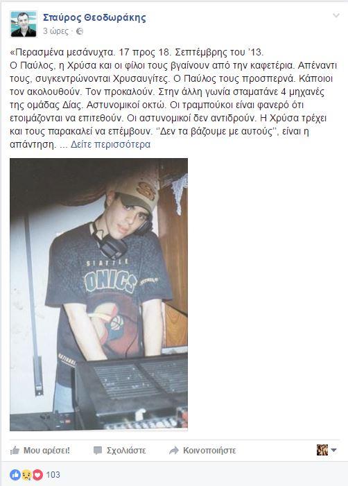 Ανάρτηση στον προσωπικό του λογαριασμό στο Facebook για τη συμπλήρωση 3 χρόνων από τη δολοφονία του Παύλου Φύσσα από χρυσαυγίτες έκανε ο επικεφαλής του Ποταμιού.