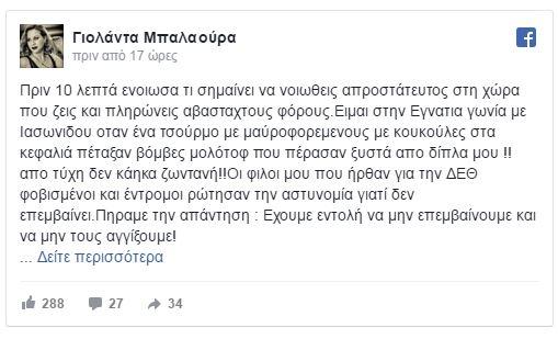 «Πριν 10 λεπτά ένοιωσα τι σημαίνει να νιώθεις απροστάτευτος στη χώρα που ζεις και πληρώνεις αβάσταχτους φόρους. Είμαι στην Εγνατία γωνία με Ιασωνίδου όταν ένα τσούρμο με μαυροφορεμένους με κουκούλες στα κεφαλιά πέταξαν βόμβες μολότοφ που πέρασαν ξυστά από δίπλα μου !! Από τύχη δεν κάηκα ζωντανή!!Οι φίλοι μου που ήρθαν για την ΔΕΘ φοβισμένοι και έντρομοι ρώτησαν την αστυνομία γιατί δεν επεμβαίνει. Πήραμε την απάντηση: Έχουμε εντολή να μην επεμβαίνουμε και να μην τους αγγίξουμε!