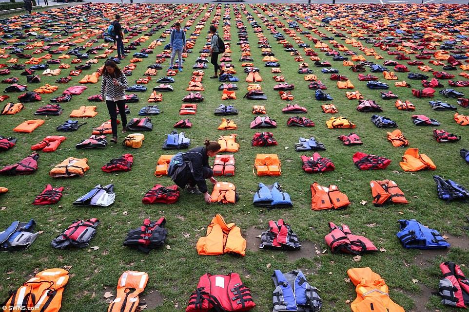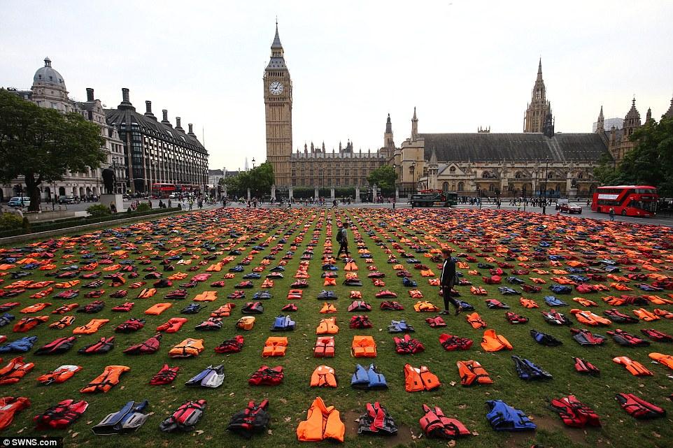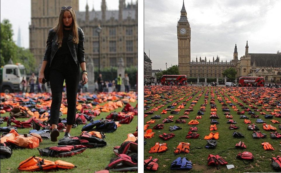 Μέλη μη κυβερνητικών κι ανθρωπιστικών οργανώσεων άφησαν 2.500 σωσίβια, που συμβολίζουν τους επικίνδυνους διάπλους των προσφύγων με προορισμό την Ευρώπη, στο πλαίσιο μιας έκθεσης έξω από το βρετανικό κοινοβούλιο σήμερα που συμπίπτει χρονικά με την Σύνοδο των Ηνωμένων Εθνών με θέμα την προσφυγική κρίση παγκοσμίως.