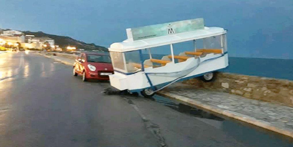 Ακόμα και στην πόλη της Ζακύνθου προκλήθηκαν υλικές ζημιές από τους δυνατούς ανέμους με χαρακτηριστικό παράδειγμα η μετακίνηση βαγονιού από τρενάκι που κάνει το γύρω της πόλης.