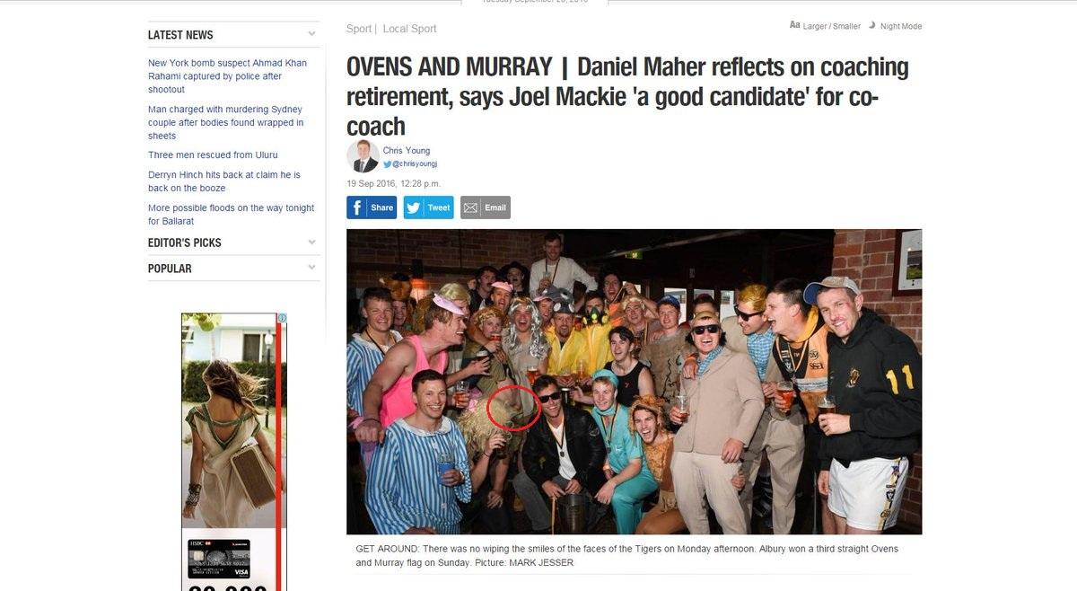 Η εν λόγω ακατάλληλη φωτογραφία συνοδεύει ένα άρθρο για τη συνταξιοδότηση ενός άνδρα, του Ντάνιελ Μάχερ, ο οποίος είναι προπονητής της ομάδας ποδοσφαίρου «Albury Tigers».