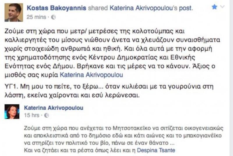 «Ζούμε στη χώρα που μετρ/ μετρέσες της κωλοτούμπας και καλλιεργητές του μίσους νιώθουν άνετα να χλευάζουν συναισθήματα χωρίς στοιχειώδη ανθρωπιά και ηθική. Και όλα αυτά με την αφορμή της χρηματοδότησης ενός Κέντρου Δημοκρατίας και Εθνικής Ενότητας ενός Δήμου. Βρήκανε και τις μέρες να το κάνουν. Άξιος ο μισθός σας κυρία Κατερίνα Ακριβοπούλου. ΥΓ1. Μη μου το πείτε, το ξέρω… όταν κυλιέσαι με τα γουρούνια στη λάσπη, εκείνα χαίρονται και εσύ λερώνεσαι».