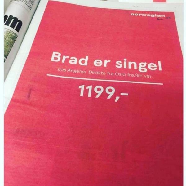 Η Norwegian Airlines, λοιπόν,αποφάσισε να κάνει έκπτωση σε όσους ταξιδεύουν στο Λος Άντζελες, δημιουργώντας μία διαφήμιση με τίτλο «Brad is single», δηλαδή ο Μπραντ Πιτ είναι ελεύθερος.