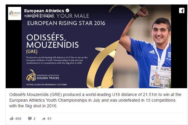 Στην κατηγορία του «Ανερχόμενου αθλητή» υπάρχουν δύο Ελληνες αθλητές ο Εμμανουήλ Καραλής και ο Οδυσσέας Μουζενίδης. Ο Καραλής βελτίωσε στη διάρκεια της χρονιάς τρεις φορές την κορυφαία επίδοση όλων των εποχών παγκοσμίως στο επί κοντώ Παίδων, ενώ κατέκτησε το χρυσό μετάλλιο στο Ευρωπαϊκό Πρωτάθλημα Παίδων. Στην ίδια κατηγορία είναι υποψήφιος και ο σφαιροβόλος Μουζενίδης με χρυσό μετάλλιο στο Ευρωπαϊκό Πρωτάθλημα και πανελλήνια ρεκόρ τόσο στην κατηγορία του όσο και στην κατηγορία των Εφήβων. Οι φίλοι του στίβου μπορούν να ψηφίσουν τους αθλητές μας στο social media της Ευρωπαϊκής ομοσπονδίας..