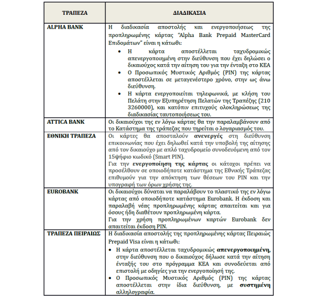 Η διαδικασία παραλαβής της προπληρωμένης κάρτας από τους δικαιούχους ΚΕΑ, εξαρτάται από την τράπεζα που έχουν δηλώσει στην αίτησή τους.