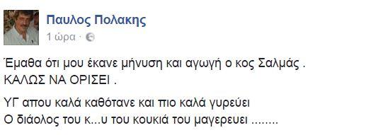 “Έμαθα ότι μου έκανε μήνυση και αγωγή ο κ. Σαλμάς. ΚΑΛΩΣ ΝΑ ΟΡΙΣΕΙ” έγραψε ο κ. Πολάκης στο Facebook και ως υστερόγραφο του αφιέρωσε μια μαντινάδα.