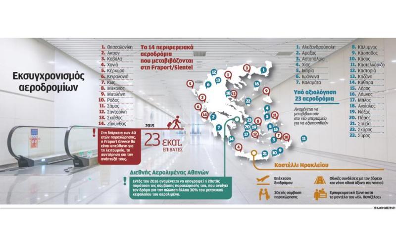 Σε ολική αναδιάταξη οδηγείται ο ελληνικός χάρτης των αεροδρομίων πριν καν εκπνεύσει το 2016, καθώς ολοκληρώνεται η μεταβίβαση των 14 περιφερειακών αεροδρομίων στην κοινοπραξία Fraport/Slentel, υπογράφεται η 20ετής παράταση της σύμβασης παραχώρησης του Διεθνούς Αερολιμένα Αθηνών, που ανοίγει τον δρόμο για την πώληση άλλου 30% του μετοχικού κεφαλαίου του ΔΑΑ, και ξεκινά ο διαγωνισμός για την κατασκευή και παραχώρηση του νέου αεροδρομίου στο Ηράκλειο της Κρήτης. Παράλληλα προχωράει και η αξιολόγηση των διαθέσιμων και εμπορικά εφικτών δομών συναλλαγής για τα άλλα 23 εναπομείναντα περιφερειακά αεροδρόμια, που διατηρεί στο χαρτοφυλάκιό του το ΤΑΙΠΕΔ αλλά θα μεταβιβάσει προς αξιοποίηση στο νέο υπερταμείο.