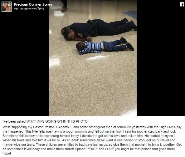 Η αστυνομικός Precious Cornner-Jones ήταν σε μία σχολική εκδήλωση όταν είδε ένα μικρό αγοράκι να έχει ξαπλώσει στο πάτωμα και να είναι λυπημένο. Τότε όπως φαίνεται και στην εικόνα ξάπλωσε δίπλα του και του μίλησε για να το καθησυχάσει.